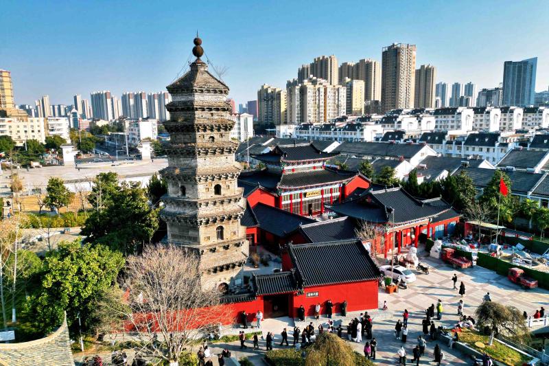 裕安区北塔公园内,砖石古塔倚着红墙古建,身后立着鳞次栉比的现代高楼。如今这里成了网红打卡点:古雅塔身与都市天际线相映,广场上人流熙攘,老地标裹着新潮人气,成了城区里古今相融的热闹角落。(陈睿)