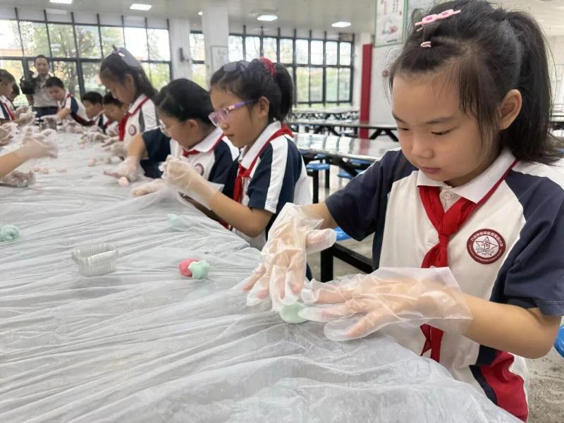 饼承家国情,劳动品香甜。“饼承家国情”活动将气氛推向高潮。在学校少工委成员的指导下,队员们兴致盎然地学习制作月饼。从和面、包馅到压模、成型,亲身体验劳动的过程,感受传统美食的制作技艺。当品尝到自己亲手制作的香甜月饼时,队员们不仅收获了劳动的快乐,更深刻体会到了月饼所承载的团圆寓意和家国一体的深厚情感。