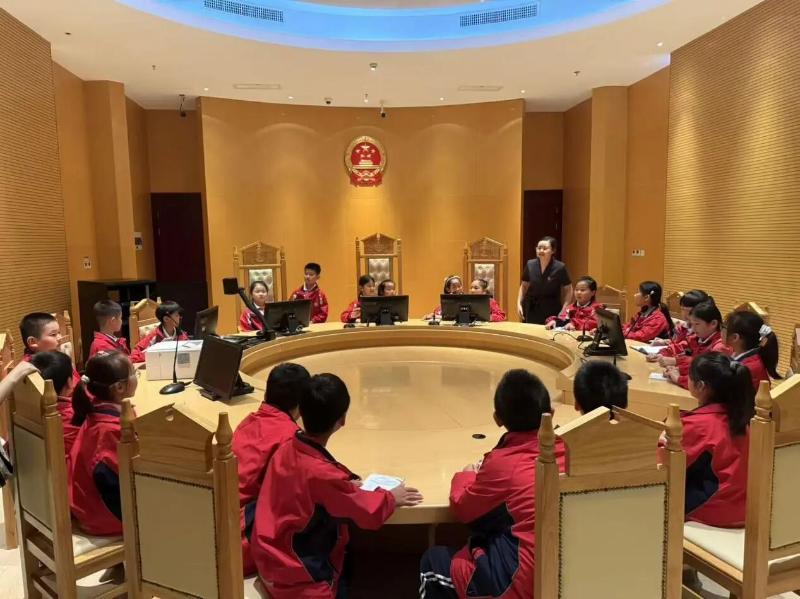 法韵庆双节,模拟法庭启心智。作为系列活动的亮点,“法韵庆双节”环节组织少先队员们走进了庄严的六安市中级人民法院。队员们不仅参观了审判法庭,了解了法院的工作职能,还开展了一场别开生面的“模拟法庭”活动。队员们分别扮演审判长、公诉人、辩护人等角色,沉浸式地体验了案件审理的全过程。通过这种生动直观的形式,法律的种子在他们心中生根发芽,不仅深刻感受到了司法的神圣与庄严,更在实践中学到了法律知识,增强了法治观念和自我保护的意识。