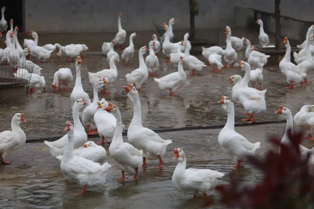 安徽展羽生态农业开发有限公司是一家集皖西白鹅良种保种、繁育、孵化、标准化饲养为一体的省级农业产业化龙头企业,公司配备全自动孵化电子设备73台套,皖西白鹅种蛋年孵化能力超450万枚,白鹅年饲养量达12万只。近年来,公司坚持走现代化、规模化、产业化、标准化、品牌化“五化”同步发展道路,2023年被农业农村部认定为全国首个皖西白鹅良种扩繁基地。自2022年以来,展羽公司加大研发投入,延伸产业链条,向二产发展,提升产品附加值,公司先后开发休闲方便鹅肉系列产品、鹅副产品深加工产品等,并批量生产进入市场,产品畅销省内外。企业采取“龙头企业+基地+农户”的运营模式,为963户皖西白鹅养殖场提供产前、产中、产后服务,带领周边农户发展皖西白鹅绿色饲养,形成了一条具有集聚效应的致富产业链。“我们的初衷就是提高皖西白鹅整个产业链的附加值,把产业链做得更长,让更多的鹅农加入到鹅产业养殖行列中,获得更好的效益,能够增收致富。”展羽公司总经理江卫军表示。在产业带动发展中,固镇镇按照“五统一分”,即统一供苗、统一配料、统一技术、统一防疫、统一收购、分散饲养的方式组织进行规模化饲养。家住汲河村的聂国保养殖皖西白鹅有20多年了。近几年来,在展羽公司的帮扶下,养殖规模有了较大的提升,收益也增加了不少。目前,聂国保的鹅场里存栏皖西白鹅3000多只,其中种鹅1000多只。“ 技术由公司负责,我们负责饲养,出栏的鹅也可以由公司回收,种蛋由公司帮助孵化。今年收入大概在20万块钱。”聂国保说。